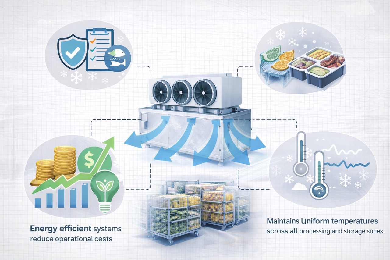 - Uniform air circulation prevents temperature stratification, ensuring consistent product quality.